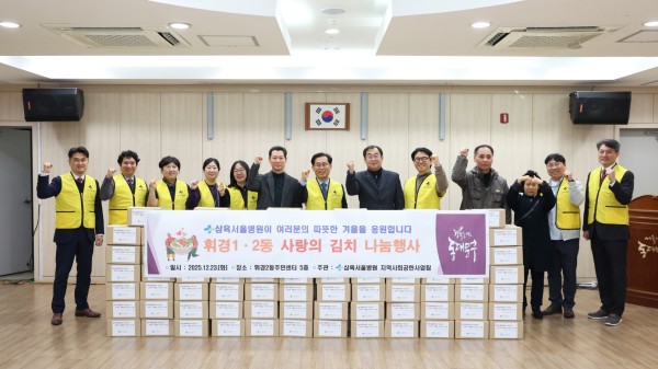 12월 23일 지역 사회공헌사업팀(진단검사의학과 김용균 과장)이 연말 지역 사회 나눔 실천의 일환으로 휘경1·2동 ‘사랑의 김치 나눔 행사’를 개최했다. 지역 사회공헌사업팀이 두 차례에 걸쳐 진행한 바자회수익금으로 비용을 마련해 김치 5kg 300상자(총 600만 원 상당)를 휘경1·2동지역 내 취약 계층 300가정에 전달했다.