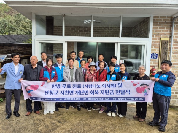 10월 18일 유점교회(담임목사 윤세수)가 영남아드라의 산불 지역 회복 장기 프로젝트의 일환으로 산청지역 산불·수해 피해 주민을 위한 생활 지원 행사를 개최했다. 이날 전달식은 산청군 의원과 면장, 마을 주민이 참석한 가운데 진행했고 사랑나눔의사회가 참여해 한방 무료 진료를 펼쳤다. 이번 행사로 재림교회가 지역 사회에 새롭게 인식됐고 주택이 전소된 두 명이 지난 8월 침례를 받고 한 명은 신앙 고백으로 입교했다. 이번 지원에는 전국 교우들의 후원과 더불어 진주지구, 경남여성협회, 경남평실협, 영남아드라가 함께했다.